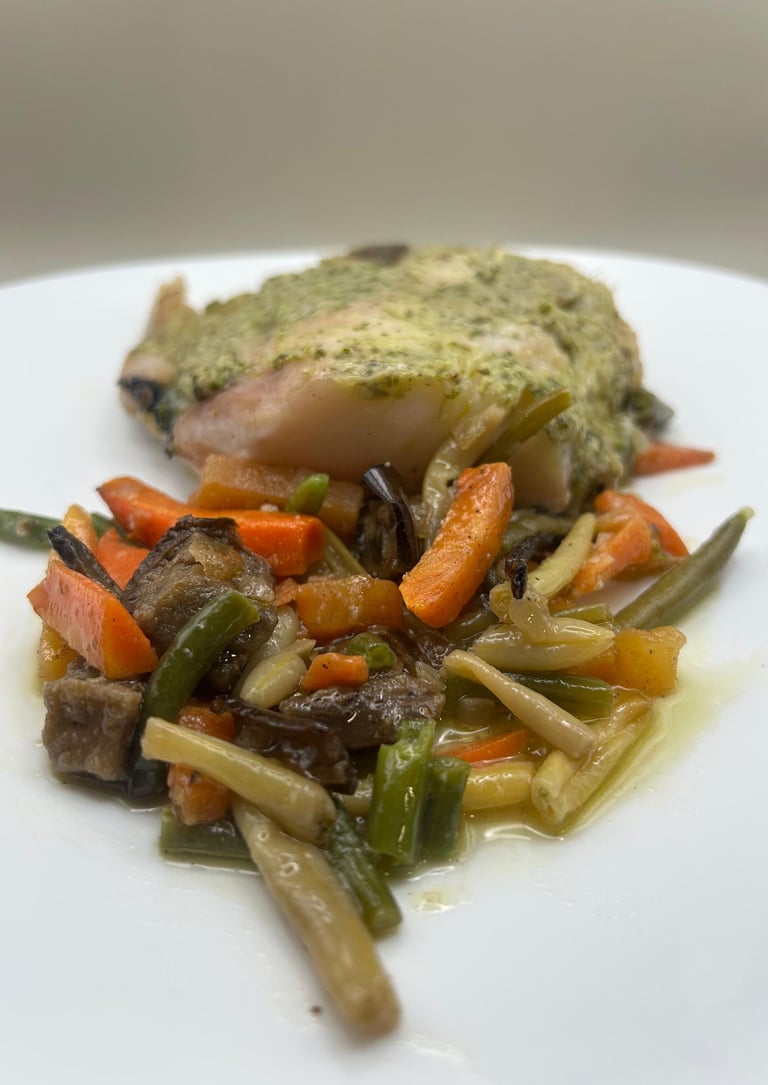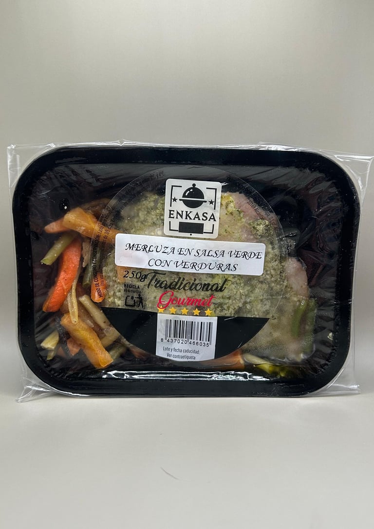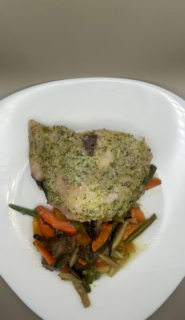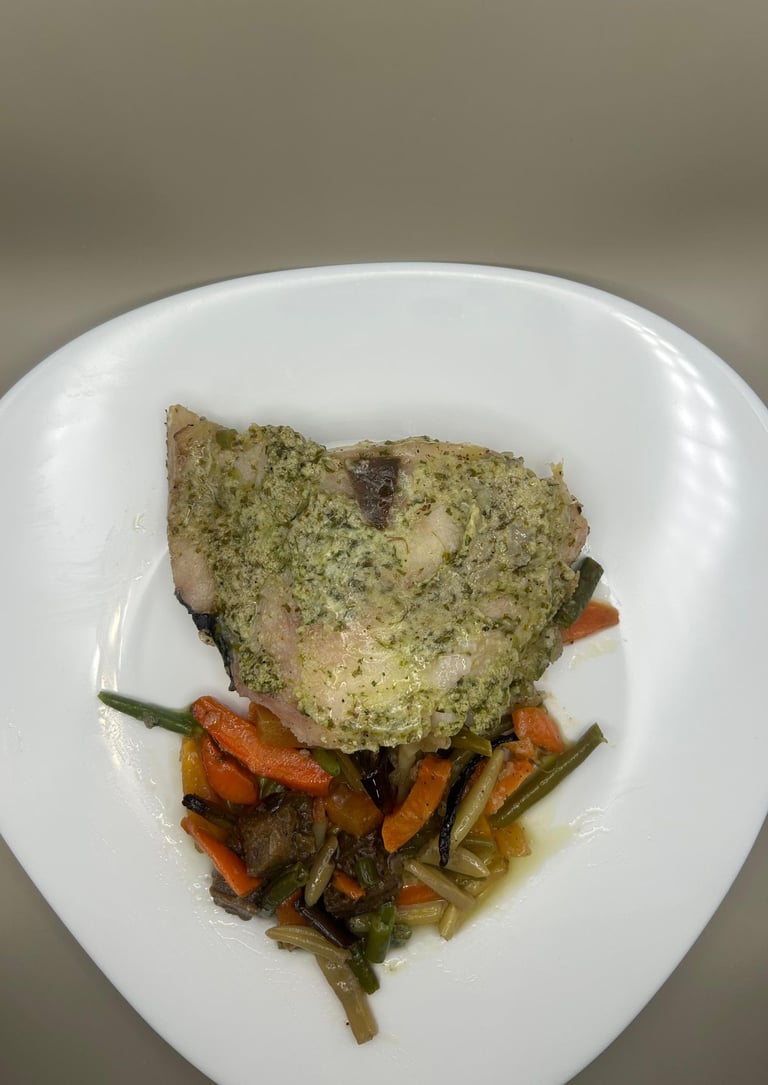 Merluza al horno en salsa verde con verduras